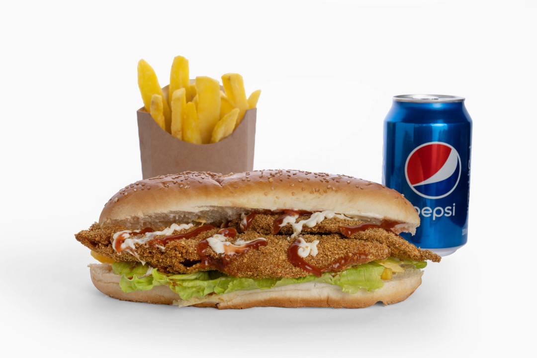قطع صدر الدجاج المقرمش / ميونيز /كول وسلو / خس / بطاطا + علبة بطاطا مقلية + مشروب (منتج تركي) من اختيارك