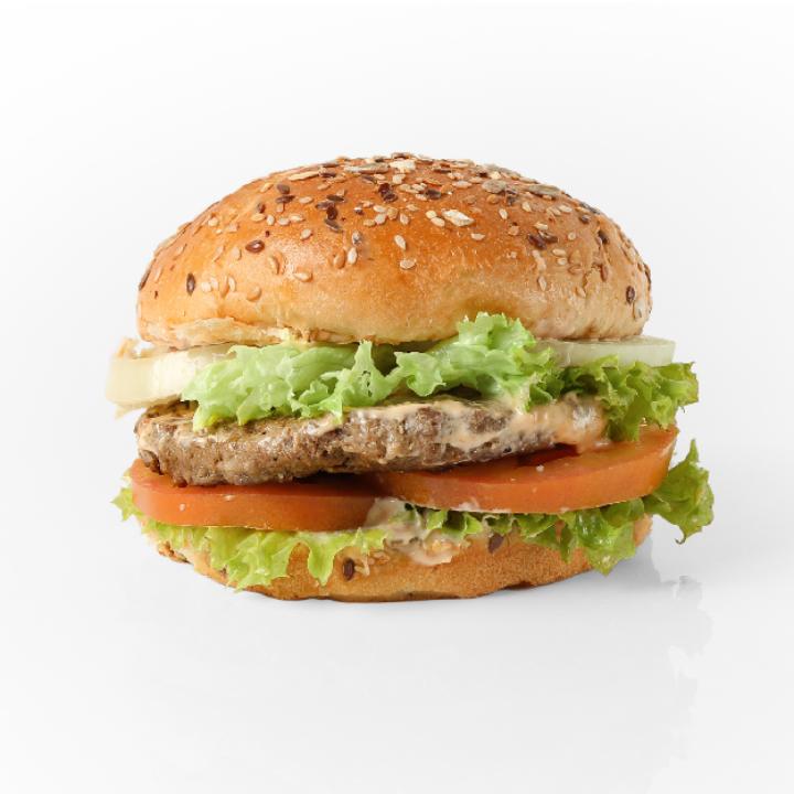 برغر لحمة مع جبنة شيدر، بندورة، بصل وصوص حلو