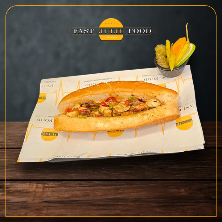 تقدم بخبز الصمون، شرائح دجاج، فطر، بصل، صلصة المايونيز، جبنة الموزاريلا والفلفل الاخضر والاحمر.