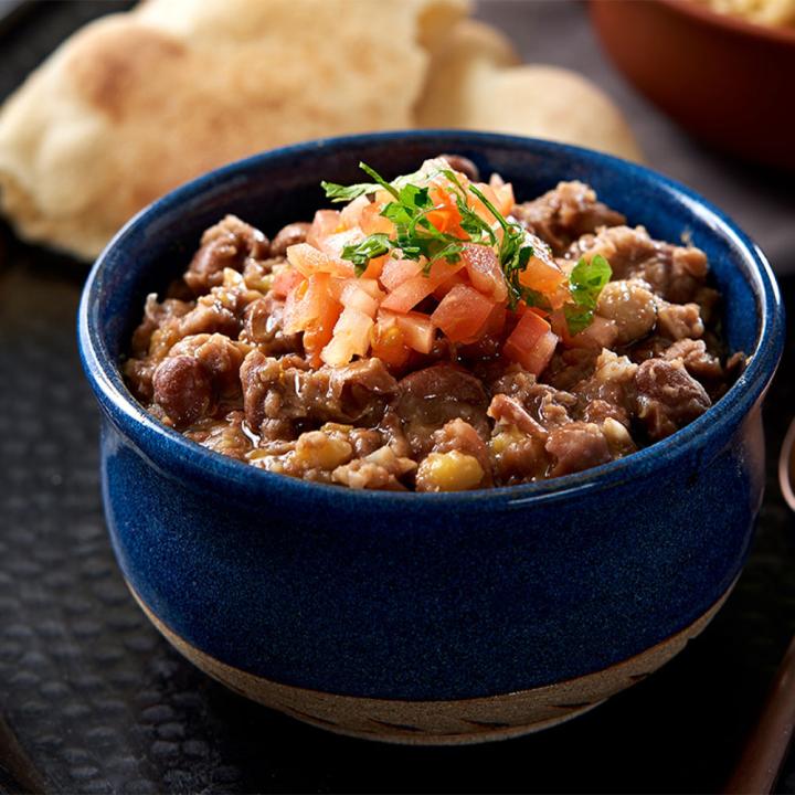 Favabønner med yoghurt, tahinisaus, hvitløk, persille og tomatFava beans with yogurt, tahini sauce, garlic, parsley and tomato