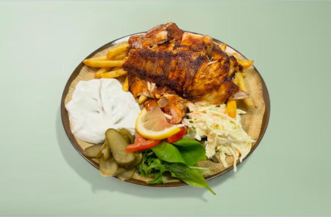 Grillet kylling med hvitløksaus, syltet agurk, salat og tahinisaus. Serveres med pommes frites. *H, EGrilled chicken with garlic sauce, pickles, salad and tahini sauce. Served with French fries. *H, E