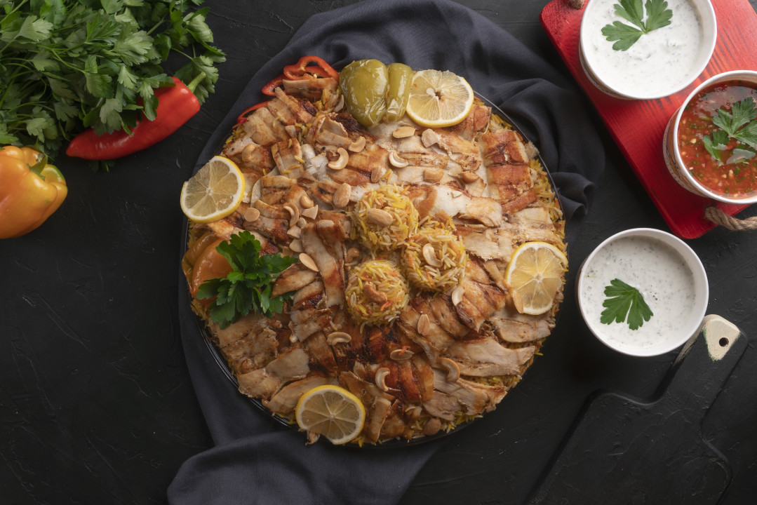 منسف مندي بشرائح الشاورما و المكسرات خمس اشخاص - Mazaj Restaurant & Cafe